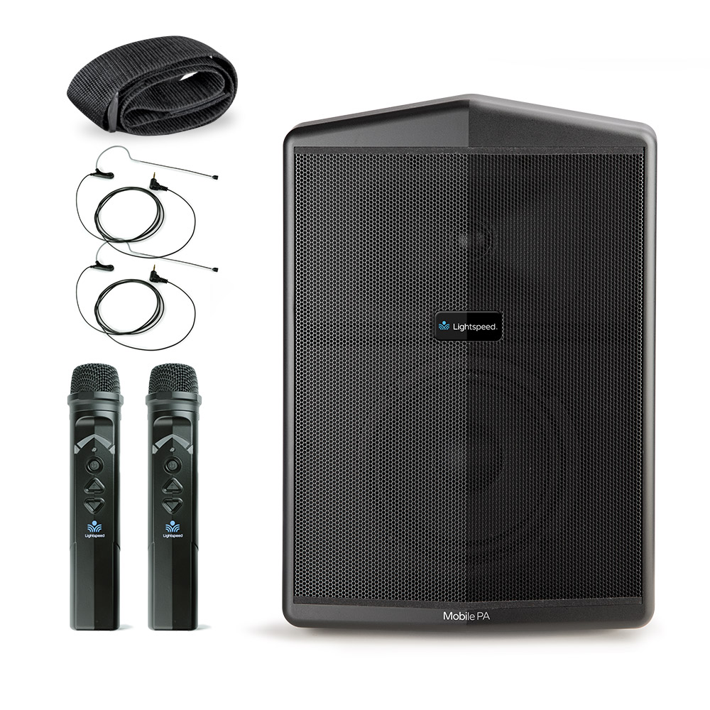 Lightspeed Mobile PA is a portable, all-in-one instructional audio system. This Mobile PA Sound System comes with battery pack, 2 Sharemikes, rechargeable batteries, and carry strap.