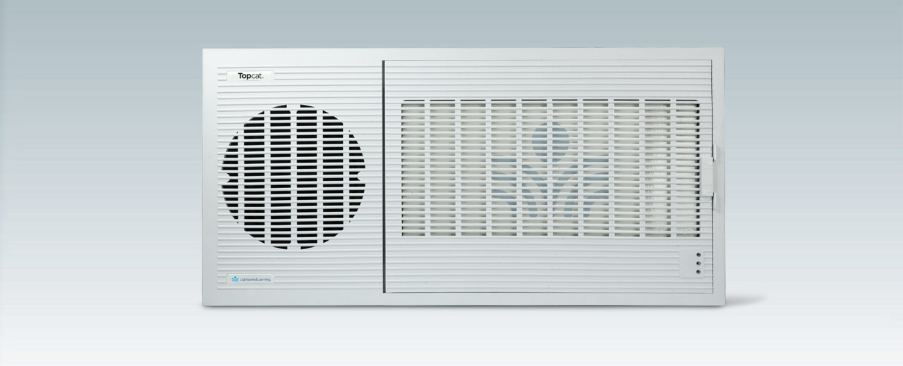 All-in-one ceiling-mount classroom audio system with integrated hybrid speaker system.